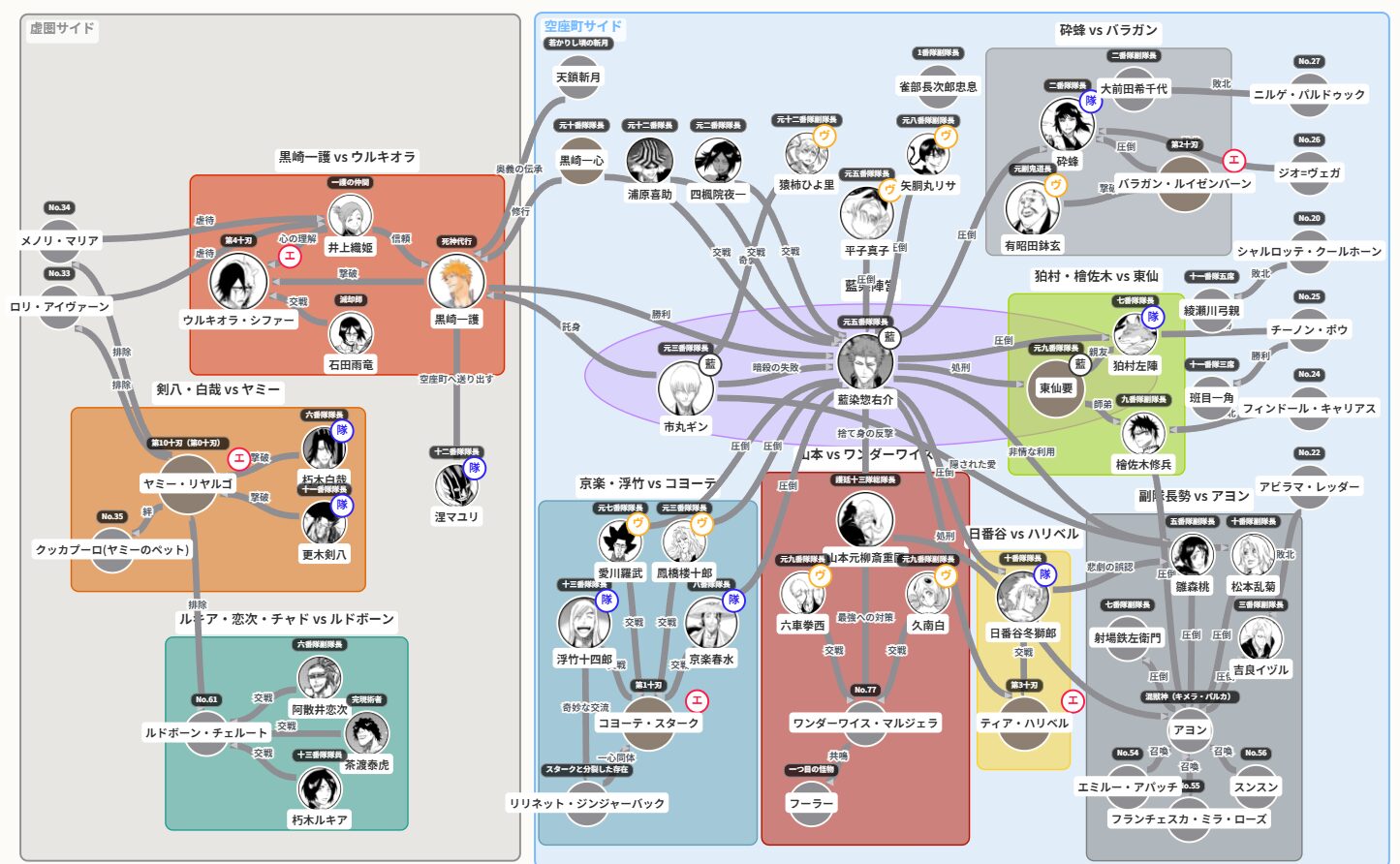 破面・空座決戦篇~滅亡篇の、黒崎一護・護廷十三隊 vs 藍染惣右介・破面の関係性を表示しています。