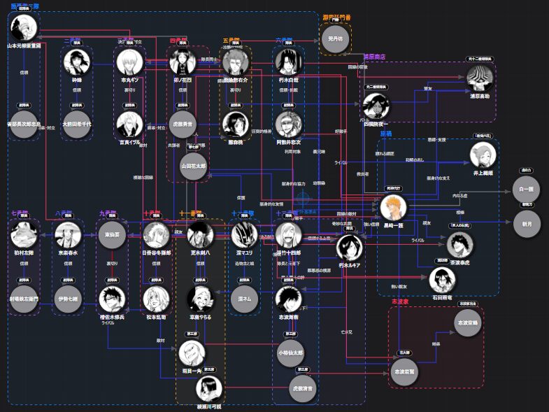 人物関係・勢力構造を、相関図で一覧確認できます。
