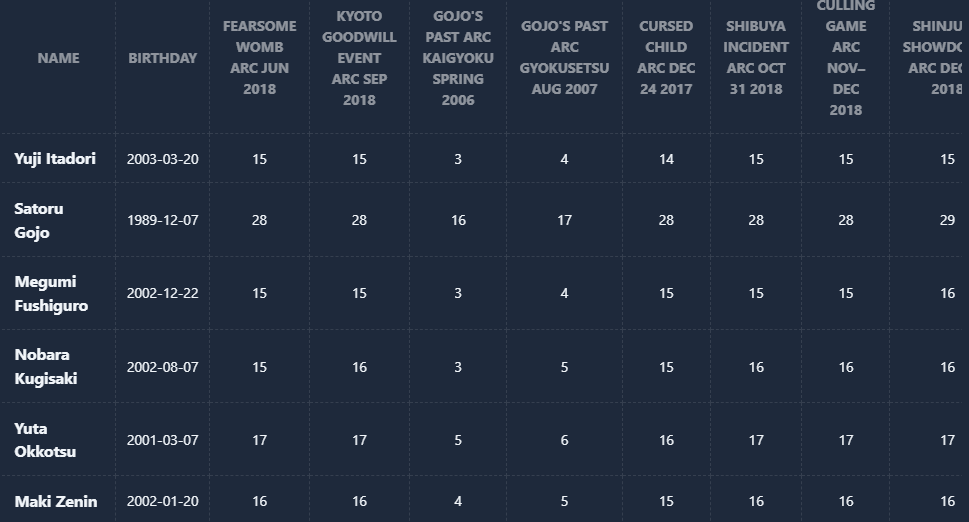 This page features an age chart for all major characters in the 『Jujutsu Kaisen』. You can track their ages across the timeline and use our search tool to find characters from your same generation.