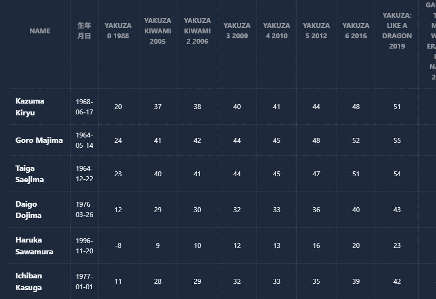 This page features an age chart for all major characters in the 『Yakuza: Like a Dragon』 series. You can track their ages across the timeline and use our search tool to find characters from your same generation.