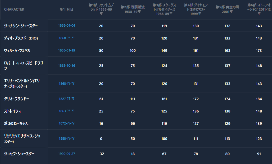 『ジョジョの奇妙な冒険』第1部~第6部の、ジョースター、承太郎、DIOなど主要キャラクターの生年月日と作中年齢を、1888年のPart1『ファントムブラッド』~2011年のPart6『 ストーンオーシャン 』まで時系列で整理しています。