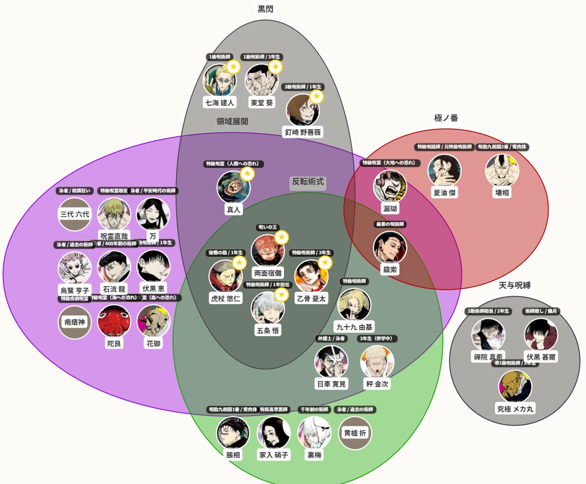 領域展開、反転術式、極ノ番、黒閃、天与呪縛を誰が使えるか、能力習得状況が分かる分布図にしています。