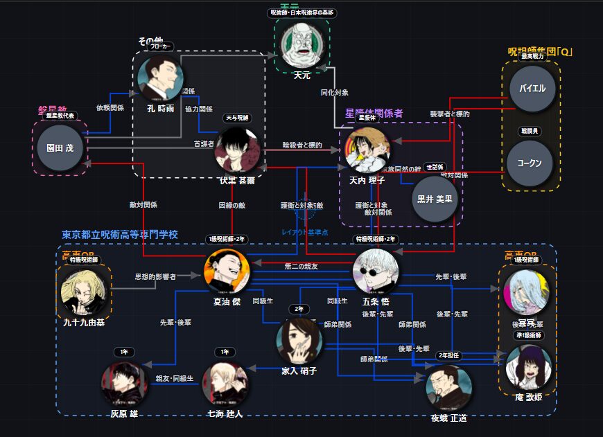 本ページでは『呪術廻戦 懐玉・玉折編』に登場する主要キャラクターのキャラクター相関図、キャラクター一覧を掲載しています。人物関係・勢力構造を、相関図で一覧確認できます。