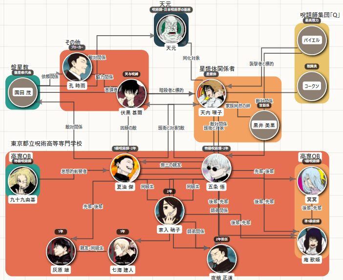 『呪術廻戦』懐玉・玉折に登場するキャラクターの関係性と勢力構図を、相関図で分かりやすくまとめました。