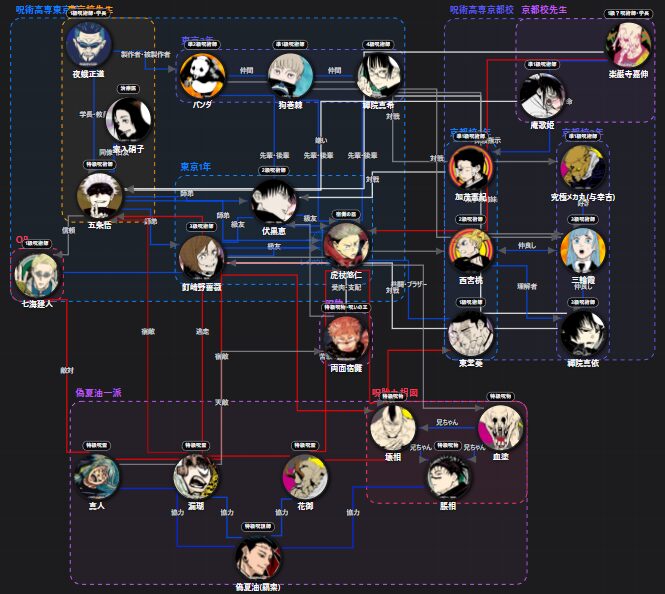 本ページでは呪術廻戦 序盤~京都姉妹校編に登場する主要キャラクターのキャラクター相関図、キャラクター一覧を掲載しています。人物関係・勢力構造を、相関図で一覧確認できます。