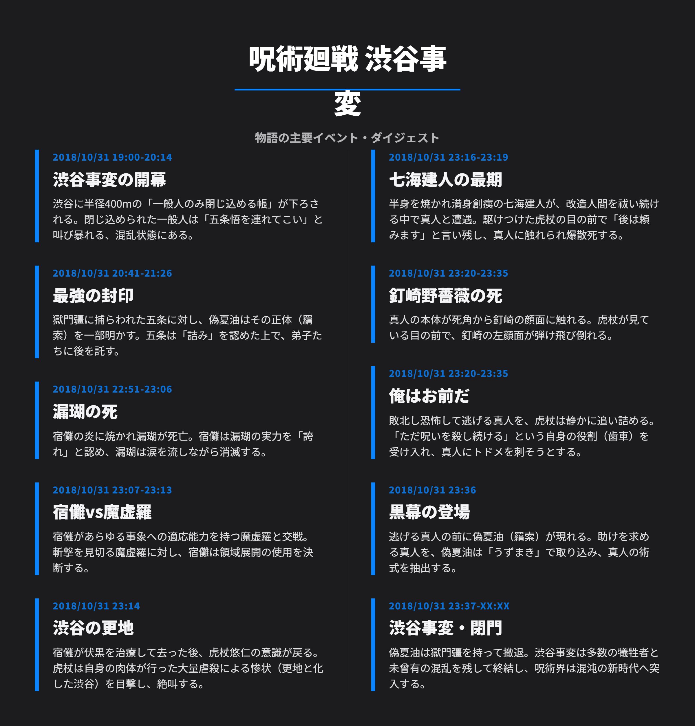 本ページでは『呪術廻戦 渋谷事変編』に登場する主要イベントの時系列年表を掲載しています。
