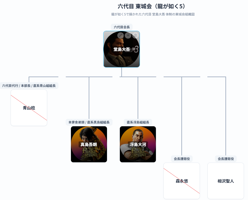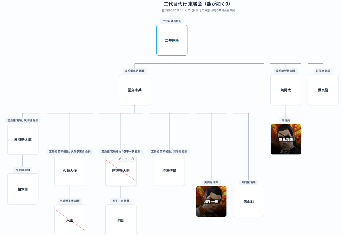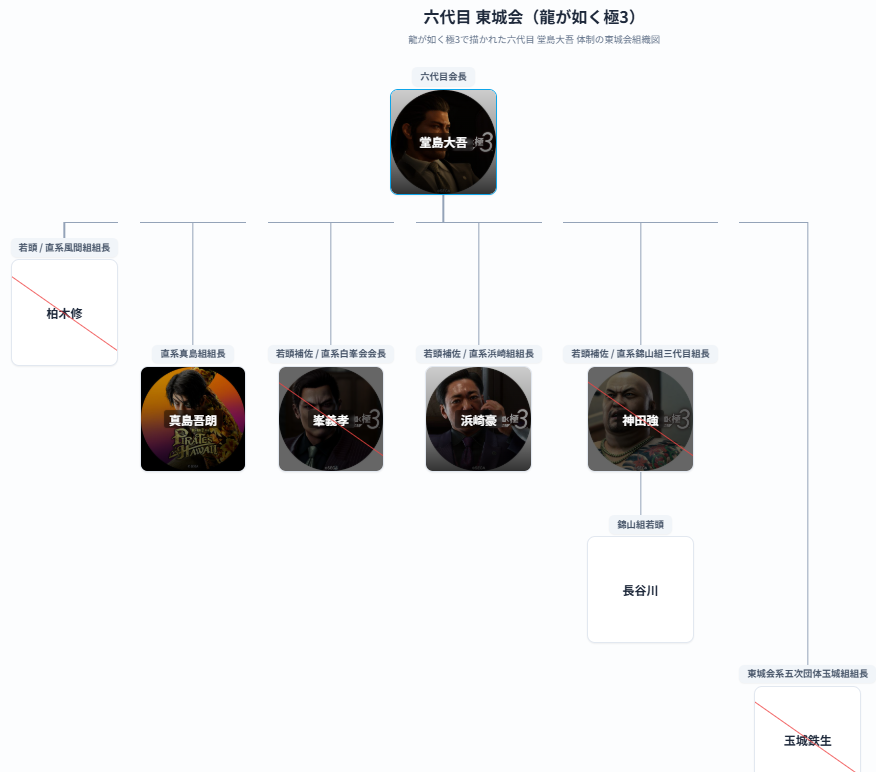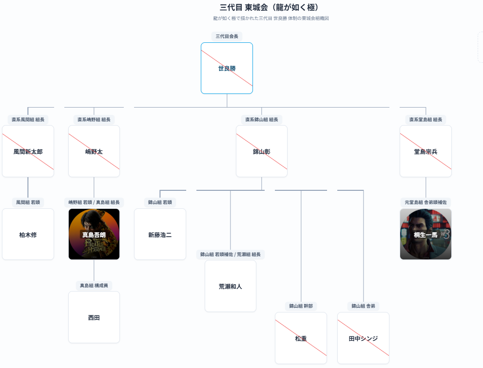作品ごとに勢力図や幹部構成が変化していく東城会の歴代会長ごとの組織図を作品別にまとめています。