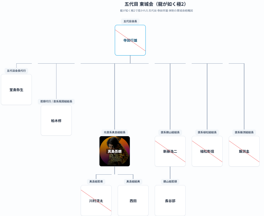 | 五代目 | 寺田 行雄 | 龍が如く極 終盤 〜 龍が如く極2 序盤 | 『極』終盤で桐生の指名で五代目襲名(41歳)。『極2』序盤で襲撃の偽装工作を起こし、終盤で高島に撃たれ息を引き取る(42歳)。 |