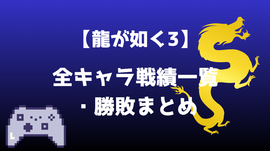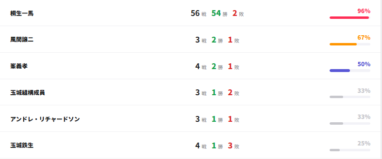 本ページでは『龍が如く 3』で繰り広げられる戦闘の対戦結果、戦績ランキングを掲載しています。