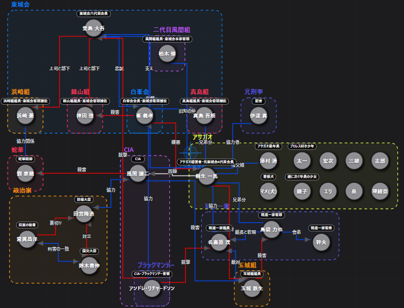 風間 譲二【CIA】 風間の実弟でCIAエージェント。兄譲りの実力と冷徹さを持ち、事件の真相と桐生を試す。武器密輸組織壊滅の影で暗躍する重要人物。