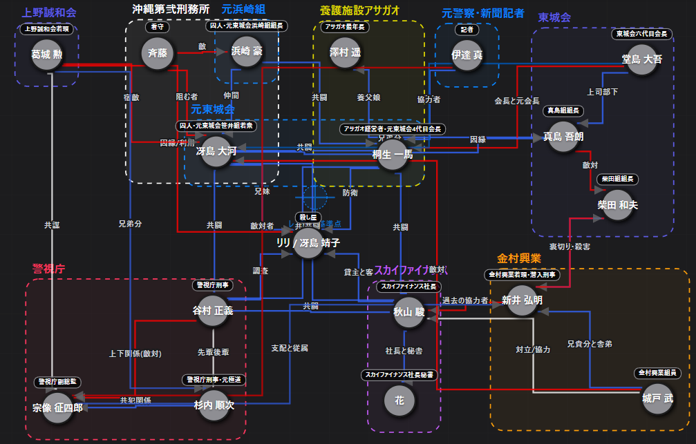杉内 順次【警視庁刑事・元極道】神室署の刑事で谷村の先輩。25年前の上野誠和会襲撃事件の真犯人であり、極道と警察の二つの顔を持つ。宗像の指示で谷村の父親を殺害。谷村に敗れた後、何者かに射殺された。