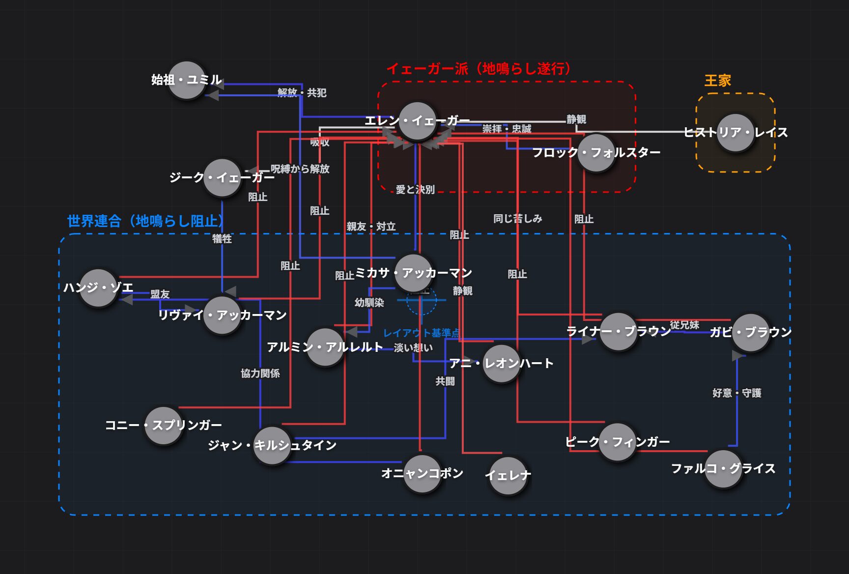 本ページでは『進撃の巨人 完結編』に登場する主要キャラクターのキャラクター相関図、キャラクター一覧を掲載しています。人物関係・勢力構造を、相関図で一覧確認できます。